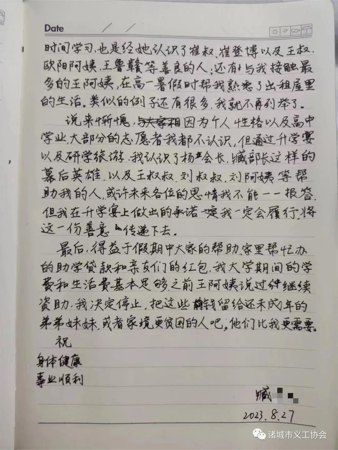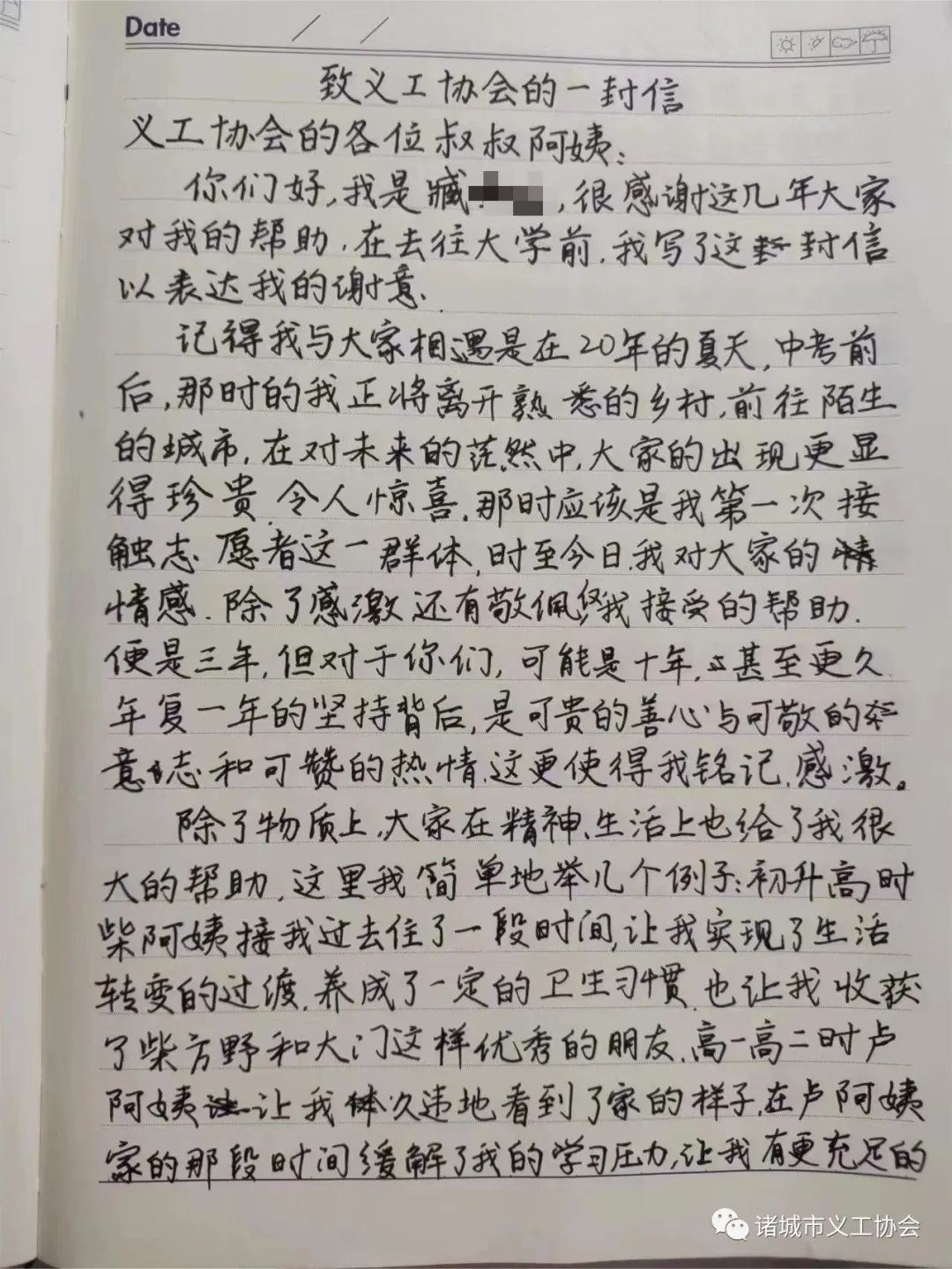 近日,诸城市义工协会收到一封来自帮扶部帮扶学生的感谢信。