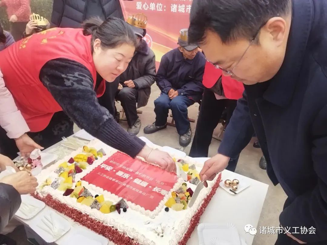为本月过生日的12位老人送上金旭食品有限公司提供的生日大蛋糕,为老人们戴上生日帽,齐唱生日歌,老人们一边吃蛋糕一边拉家常,脸上的笑容透露出他们内心的喜悦